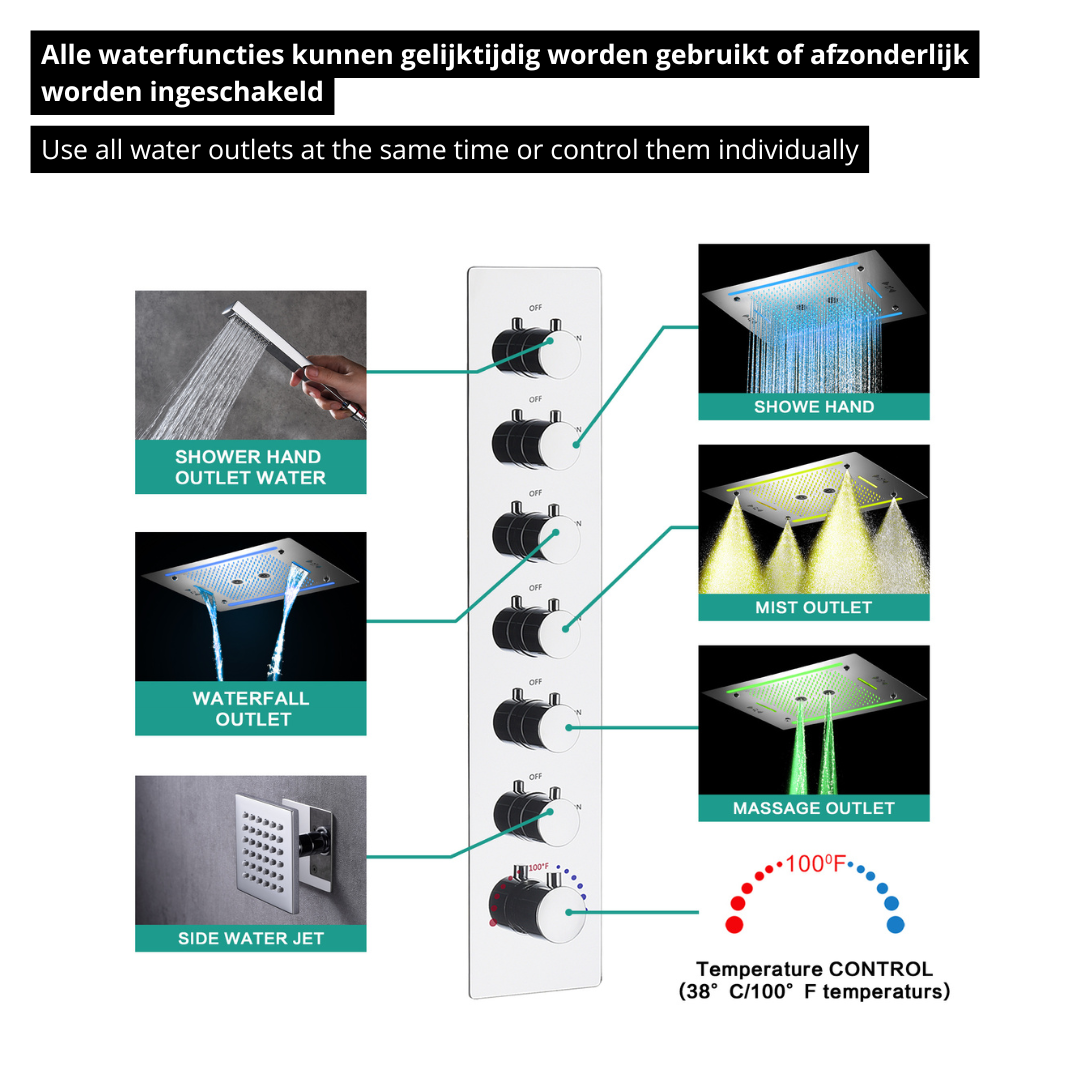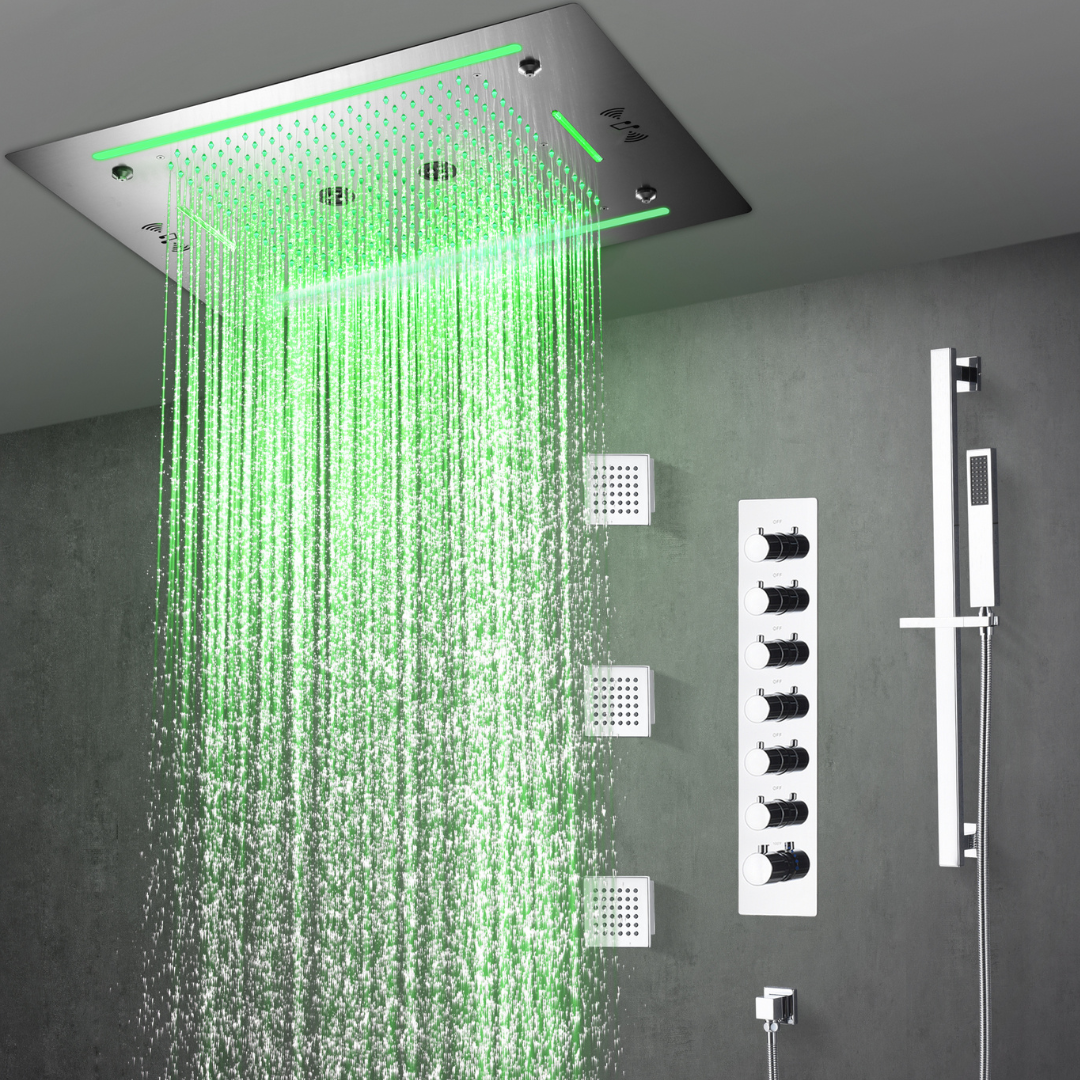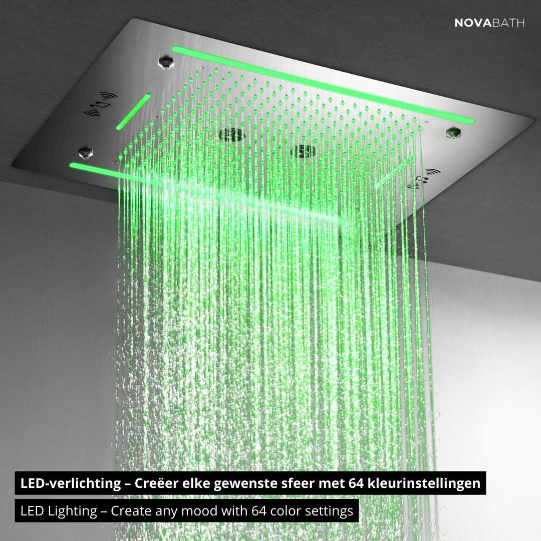 6-in-1 Thermostatische Inbouw Regendoucheset Marino – Bluetooth & Speakers – LED Verlichting – Massagejets - Chrome